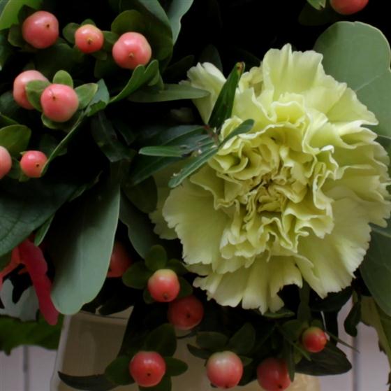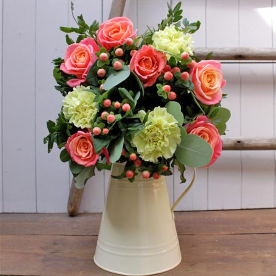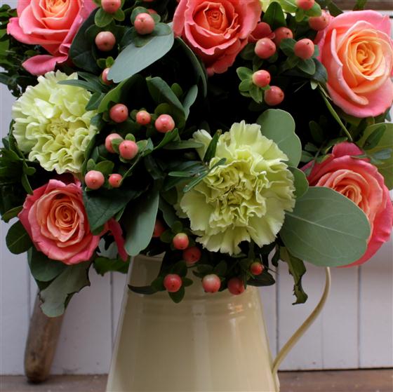 beautiful Miss Piggy coral coloured roses, pastel green carnations, berries and seasonal foliage hand tied and presented in a ceramic jug. A lovely bright design for the autumn season.