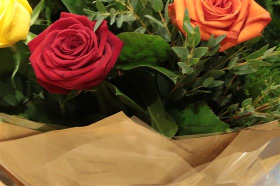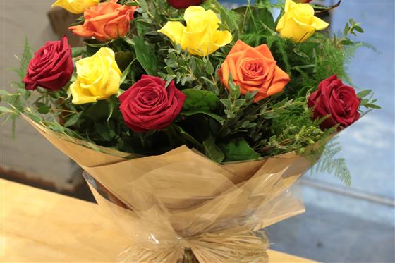 A mixed bouquet of gold, orange and red roses presented with a selection of foliage.