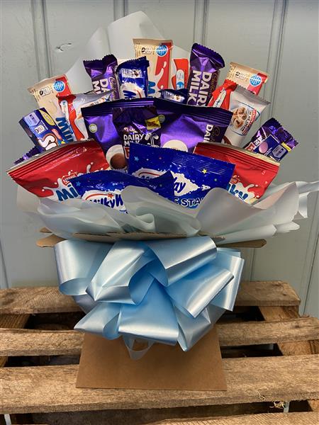 By popular demand we have created a bouquet for children (or for adults that love childrens chocolates). All of the favourites like magic stars, milky bar, freddo, smarties and fudge fingers created to delight any chocolate lover. Available in 6 sizes and 4 different wrapping colours of pink, blue, purple or red to choose from.