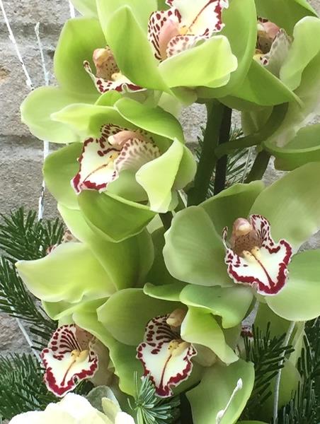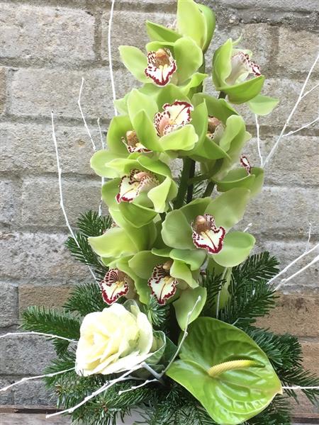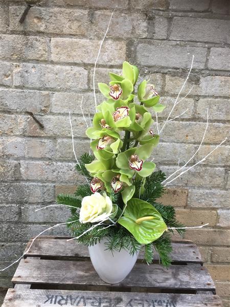 A magnificent show piece for the festive season. A beautiful 60cm Cymbidium orchid in a gorgeous shade of lime green is complimented with a green anthurium and a frosted brassica. Surrounded by pine and finished with sparkly white twigs, this really is the most beautiful gift.