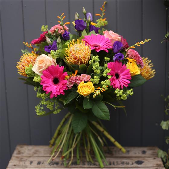 A vibrant, happy selection of the very best seasonal flowers in a variety of bright colours complimented with seasonal foliages. Beautiful for any occasion and hand picked by one of our fully trained florists.