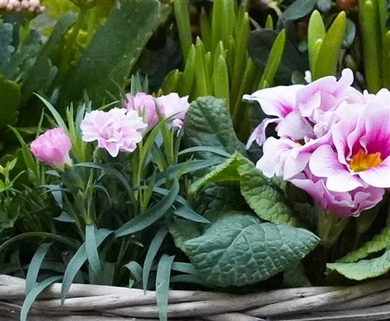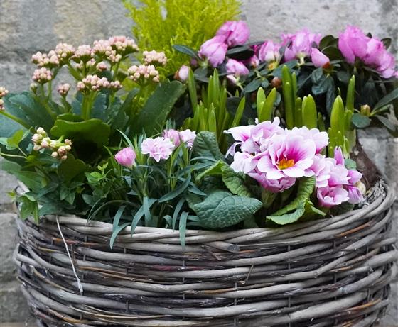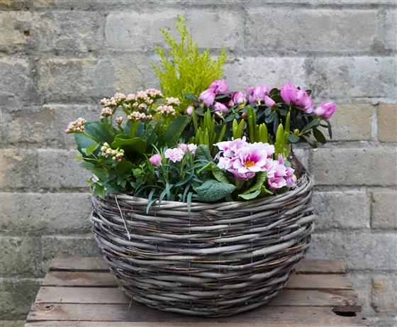 A fantastic wicker planter full of spring bulbs, primrose, dianthus etc. that is a real wow factor. Suitable for a large table indoors or in the garden.