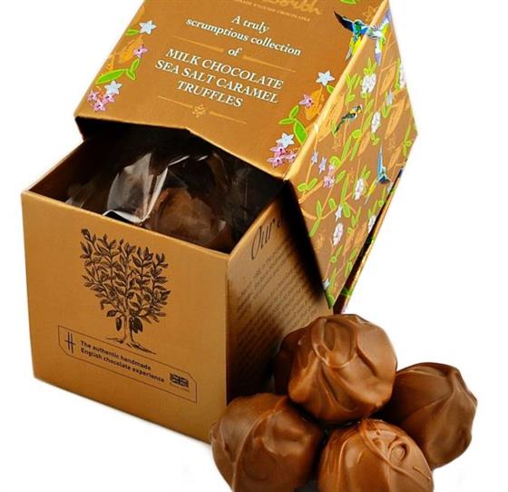 Part of our Truly Scrumptious collection, this is a perfectly petite gift box of sensational sea salt caramel truffles. Creamy caramel centres sprinkled with Cornish sea salt and hand enrobed in the finest Belgian milk chocolate couverture. Beautifully presented in a hand-finished luxury foil embossed cube with Holdsworth's unique Theobroma & Birds print on gold. The epitome of less is more, this small gift makes a big impression.