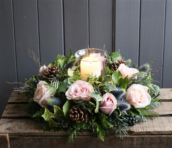 A stunning posy of flowers surrounding a candle in a glass holder. A very natural arrangement of seasonal foliage finished with pink roses and thistle.
