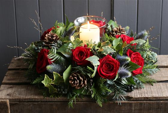 A stunning posy of flowers surrounding a candle in a glass holder. A very natural arrangement of seasonal foliage finished with red roses and thistle.
