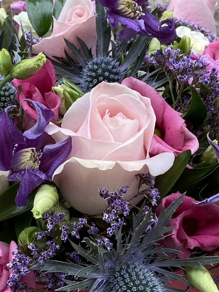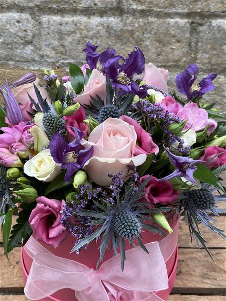 A stunning pink hatbox arrangement filled with pink, white and lavender flowers to include roses, veronica, lissianthus, spray roses and finished with lavender limonium. A really glamorous gift that can just be placed on a table for instant beauty. This is really easy to look after by just adding a small cup full of water daily for long lasting blooms. Design may vary from picture due to availability of flowers but will always be beautiful