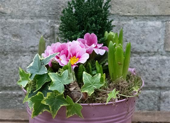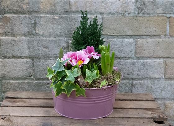 A beautiful coloured zinc planter in cream pink or dusty pink filled with seasonal plants that will change through the seasons. A great gift for any occasion.