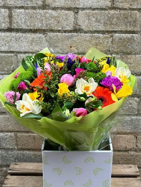 A beautiful seasonal bouquet full of spring flowers, with scented hyacinth, Iris, tulips alstroemeria to name a few. Created by one of our fully qualified florists, this lovely bouquet will grace any room and add a splash of vibrancy for the recipient to enjoy.