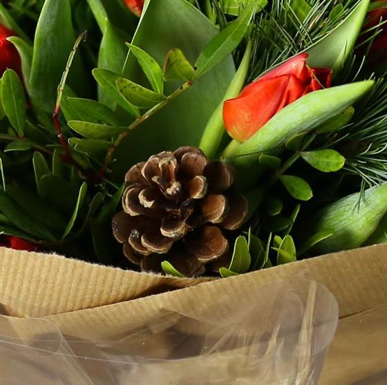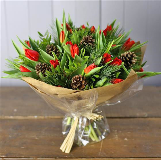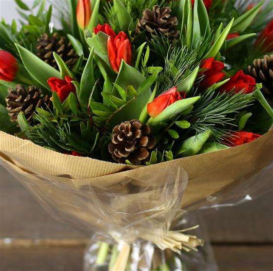 A beautifully simple hand tied posy of red tulips, pines cones and seasonal foliage.