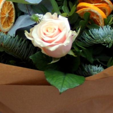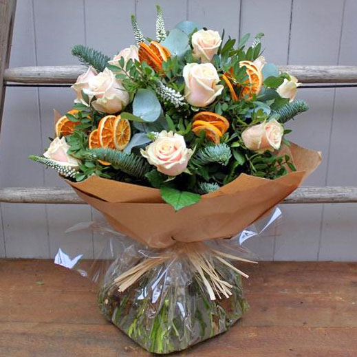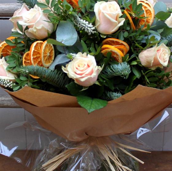 The smell of eucalyptus and oranges mixed with pine help to create this stunning bouquet of the palest peach roses and white veronica